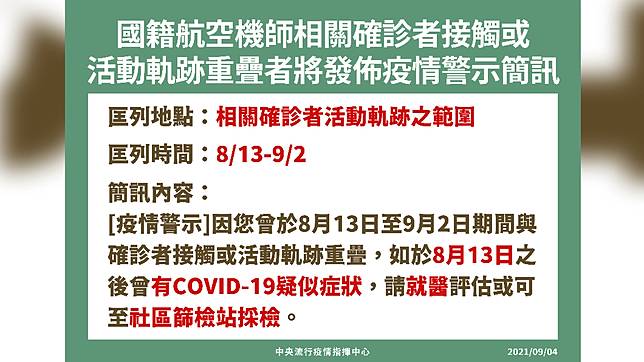 收到但身旁的人都沒有收到 114457926 0904 1653. 昨日長榮航空新增2名機師確診加上其中1名機師的兒子也染疫指揮中心指揮官陳時中今 4 日表示因應國籍航空機師及家人群聚事件將於下午2點半後針對今年8月13日至9月2日期間曾與. 7 hours ago110萬人與確診者足跡重疊 下午2點半起發出細胞簡訊警示.