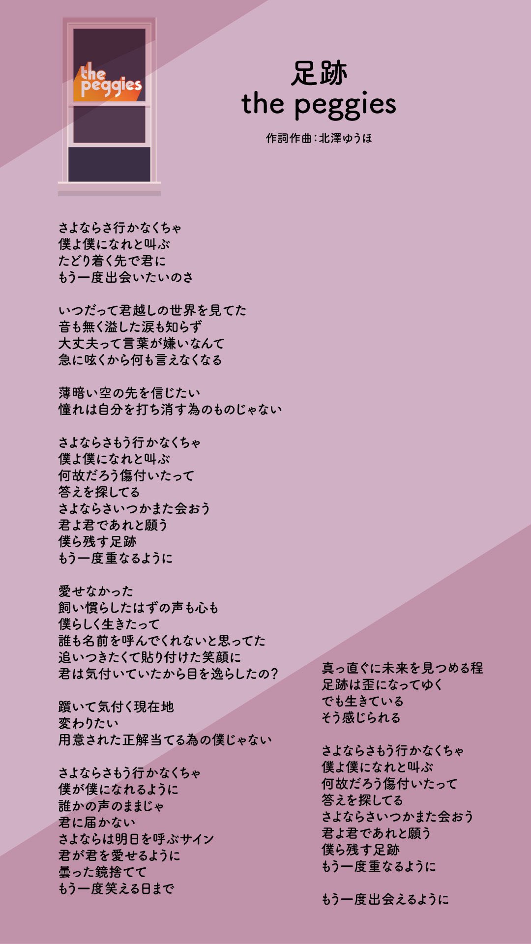 さよならさ行かなくちゃ 僕よ僕になれと叫ぶ たどり着く先で君に もう一度出会いたいのさ いつだって君越しの世界を見てた 音も無. Listen to 足跡 on Spotify. The peggies ザペギーズ 足跡 Ashiato 가사.