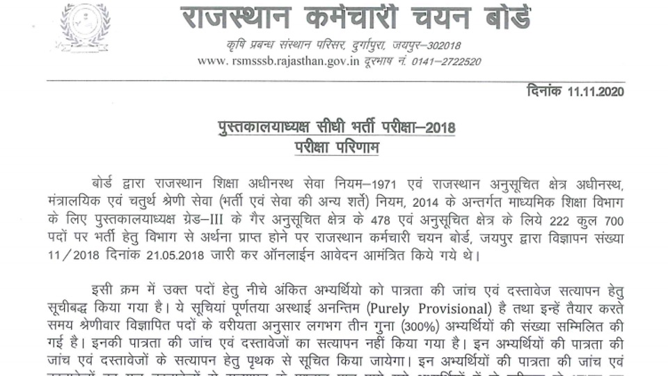 Rajasthan Rsmssb Librarian Result 2020 Declared At Rsmssb Rajasthan Gov In Here S Direct Link Hindustan Times