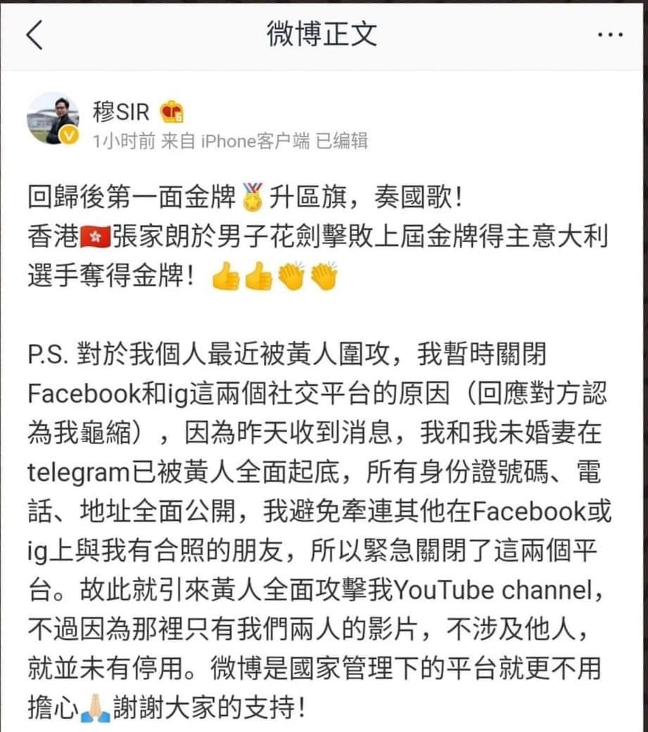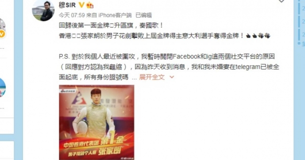 Kelly Online 穆家駿稱被起底刪fb及ig 微博現身祝賀張家朗摘金 頭條日報