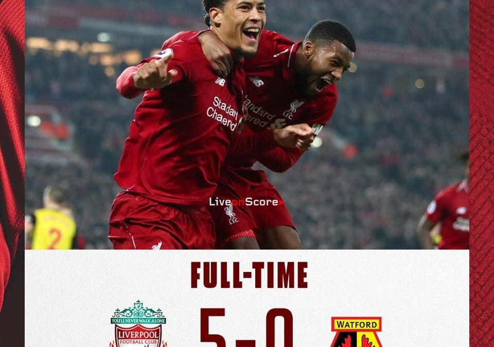 Liverpool 5 - 0 Watford. Liverpool Vs Watford 5 - 0 On 27th February 2019 by Nobody. Totally Liverpool and Watford fought for 8 times before.